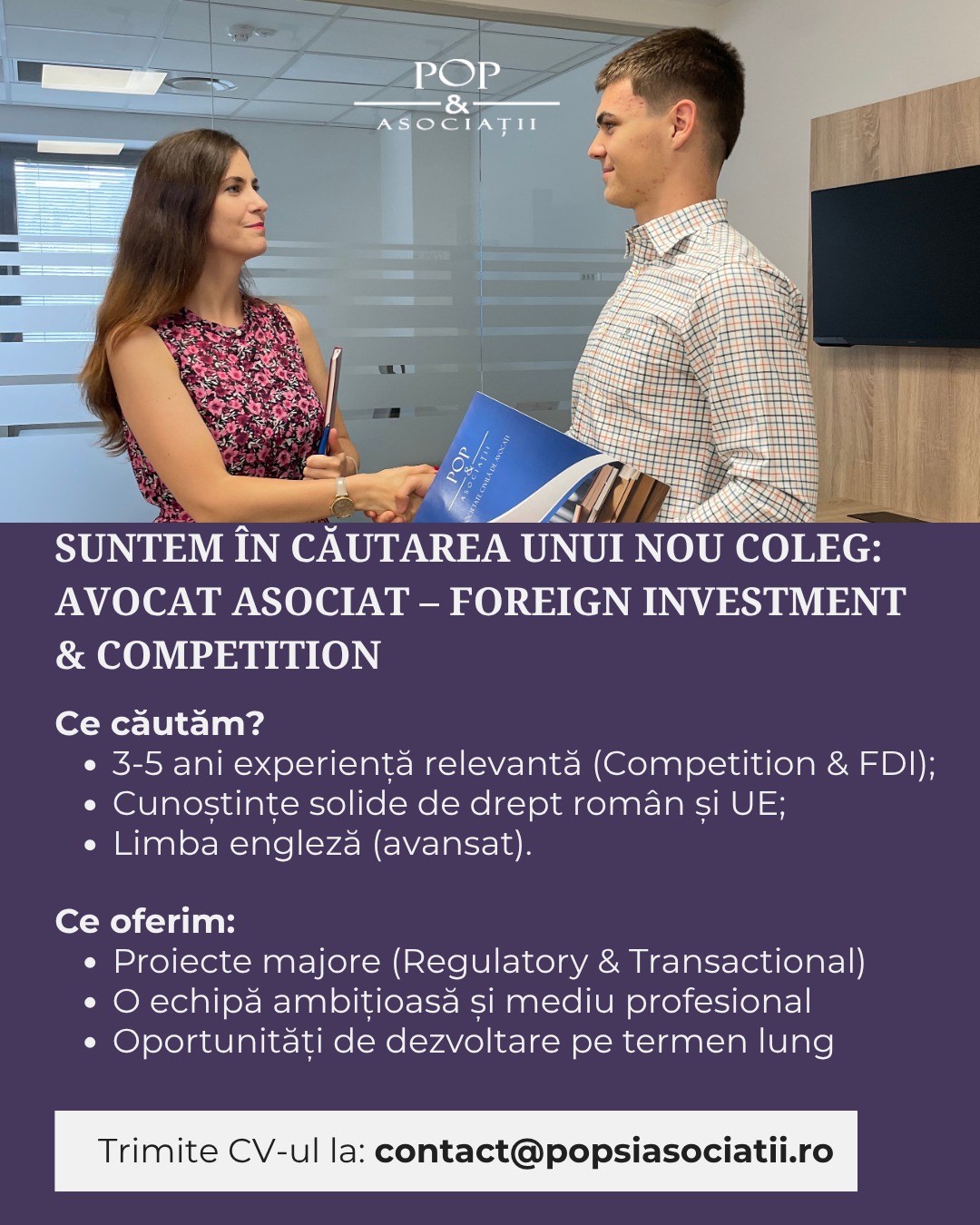 Ești un avocat cu experiență în Competition & FDI? Îți oferim cadrul în care expertiza ta este valorificată la cel mai înalt nivel. La Pop și Asociații, vei gestiona mandate complexe de natură tranzacțională și regulatory, într-un mediu care pune preț pe rigoare și performanță.